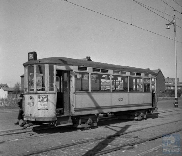 De reden waarom de 350 van de vorige foto alleen bleef, kan zijn dat de HTM liever aanhangwagens had met een grotere capaciteit. Die kwamen er dan ook. De eerste tien stuks in 1913 van Allan en de overige 60 stuks uit Duitsland, geleverd over meerdere jaren tot en met 1923. Dertig ervan met een klein balkon, zoals de 613 op deze foto; de overige hadden dubbele balkondeuren en een groter balkon . Het waren de grootste rijtuigen in het materieelbestand, de 200 niet meegerekend. Zij beschikten over eenassige draaistellen die met kruisstangen met elkaar waren verbonden. 613 staat op het eindpunt Meer en Bosch van lijn 20, een lijn die na de oorlog lijn 2 ging heten. Ook deze plaat werd door J.A. Bonthuis gemaakt, en ook tijdens de oorlog op 10 april 1944. Had Bonthuis een voorraadje rolfilms ingeslagen om ook in deze tijd door te kunnen gaan met fotograferen? (NVBS-fotonummer 109.112)
