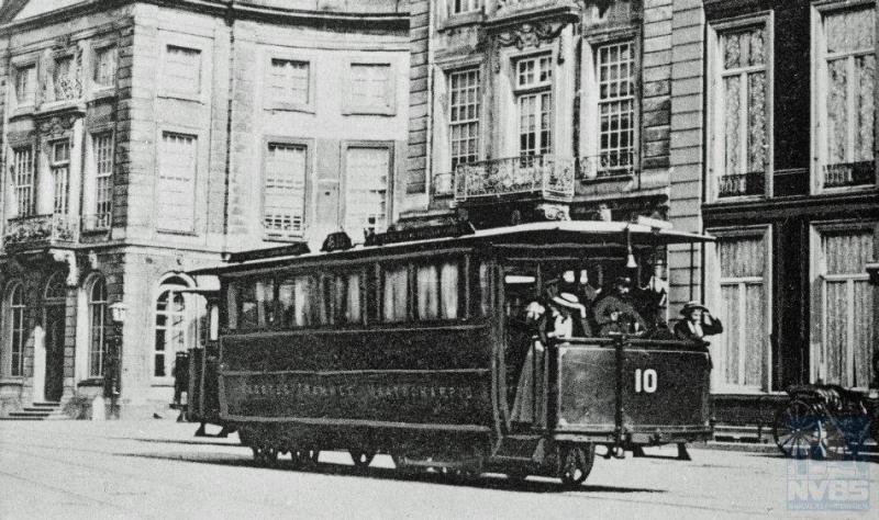 Om het niet al te ingewikkeld te maken slaan we de paarden- en stoomtramperiode over. En ook het werkmaterieel en kortstondige gasten. De eerste elektrische tram reed zonder bovenleiding en haalde de benodigde energie uit meegevoerde accu’s. Veertien van deze rijtuigen hebben vanaf 1890 op lijn 9 dienst gedaan. Het was geen onverdeeld succes doordat er nogal wat storingen optraden. Het is echter frappant dat tegenwoordig, nu de kwaliteit van accu’s stukken beter is, deze exploitatievorm weer is teruggekomen, hoewel buiten Nederland. Wie rond 1900 deze bekende foto van rijtuig 10, die hier op het Korte Voorhout de Koninklijke Schouwburg passeert, heeft gemaakt, valt niet meer te achterhalen. De repro is van J.A. Bonthuis. (NVBS-fotonummer 109.044)