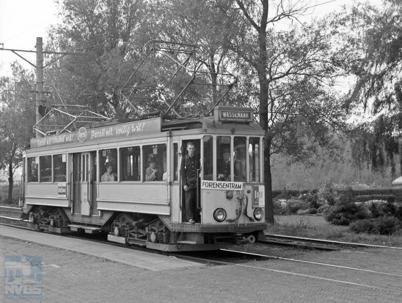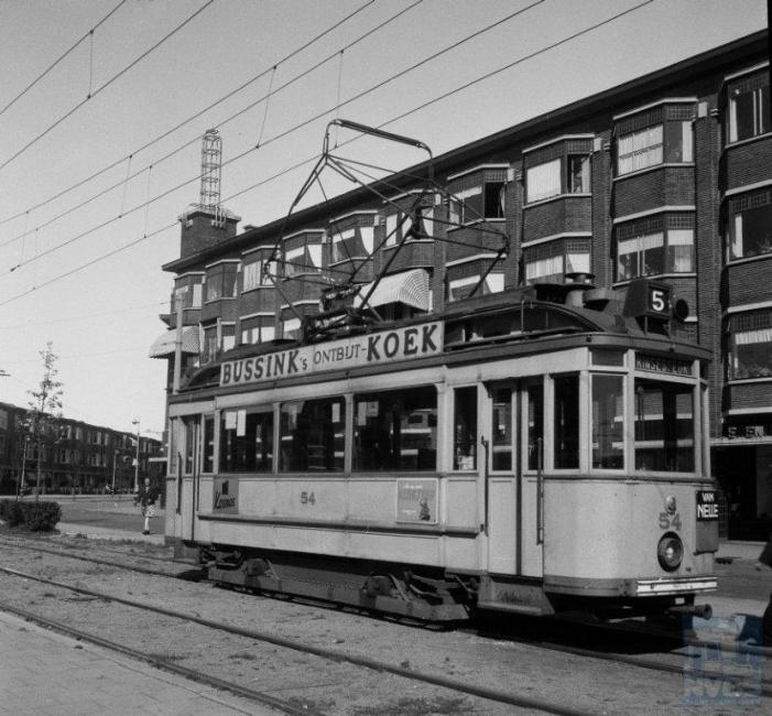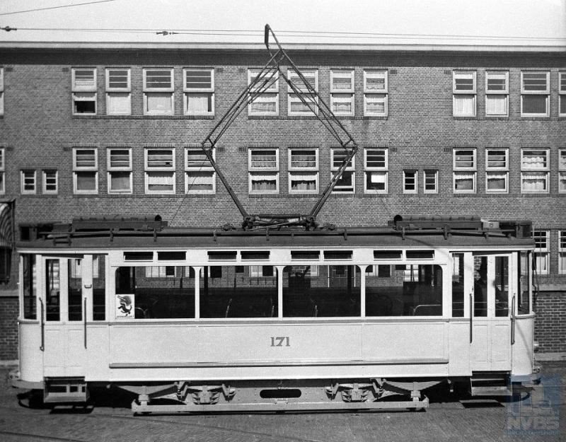 De oorlogsjaren hadden een zware tol geëist van alle Nederlandse spoor- en trambedrijven. Met minder materieel – veel rijtuigen waren gevorderd om in Duitsland gaten te vullen – maar ook met veel meer passagiers probeerde men de tramdienst draaiend te houden. Auto’s zag je bijna niet meer vanwege benzineschaarste; op de fiets durfde niemand want die werden in beslag genomen. Merkwaardig genoeg kwam het gevorderde trammaterieel voor het grootste deel na gedegen speurwerk weer terug en konden firma’s als Werkspoor dit zodanig opknappen dat het wel nieuw leek. Maar daar gingen wel wat jaren overheen en dus was het mooi dat de RET de HTM in 1946 kon helpen aan veertien oudere motorwagens die het Rotterdamse bedrijf kon missen. Op het remiseterrein aan de Lijsterbesstraat zien we rijtuig 171 staan. Aanvankelijk reden deze ‘Rotterdammertjes’ met bijwagen maar na enkele ongelukken vanwege remproblemen later zonder; ook vaak als ‘kindertram’. J. Voerman kiekte op 27 juli 1946. (NVBS-fotonummer 148.702)