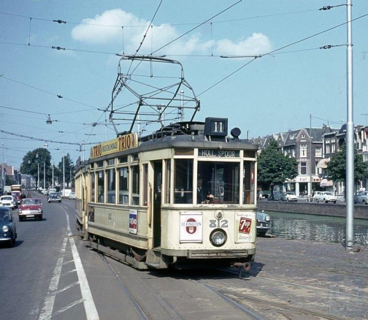 Stoomtrams hebben het langer uitgehouden dan paardentrams; zij kwamen ook later in beeld. Maar in de jaren twintig van de vorige eeuw legden verschillende stoomtramlijnen in den lande het loodje ten faveure van de moderne elektrische variant. Zo ook eind 1925 de stoomtramdienst tussen station Hollands Spoor en Scheveningen van de HSM. De HTM nam deze dienst in 1927 over met sneltramlijn 11. Het tracé lag, wegkruisingen daargelaten, geheel op eigen baan dus er kon snel worden gereden. Hier hoort natuurlijk wel passend rollend materieel bij. Dat werd besteld bij Allan in Rotterdam, aanvankelijk tien stuks maar later meer. Op de dia van T. Hobma zien we motorwagen 812, een uitrukkende extra van lijn 11 op het Zieken, datum 21 augustus 1964. Dia’s hebben bij de NVBS nooit een ‘NVBS-nummer’ gekregen.