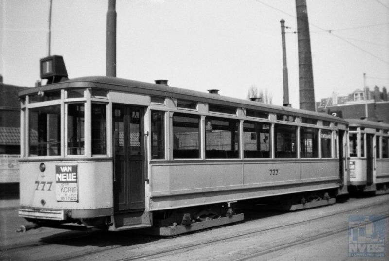 Bij deze fraaie motorwagens hoorden natuurlijk passende aanhangers. In de jaren 1927 en 1929 heeft de HTM deze besteld bij Allan en La Brugeoise. Eerst een twintigtal tweeassers, daarna dertig vierassers. Beide hebben niet alleen op de 11 gereden, maar ook op andere stadslijnen en in hun beginjaren zelfs interlokaal; zij waren daartoe uitgerust met luchtremmen, te herkennen aan de slangen op de balkonschermen. Tijdens de slappe uren koppelden de trams vaak hun aanhangwagen af, die dan bij het eindpunt bleef staan tot er weer behoefte aan was. Zo ook hier in de Rijnstraat bij het station Staatsspoor, waar vierasser 777 van lijn 1, zeker niet een van de drukste lijnen, samen met andere staat te wachten. J.A. Bonthuis heeft deze foto op 26 april 1942 gemaakt. (NVBS-fotonummer 109.123)