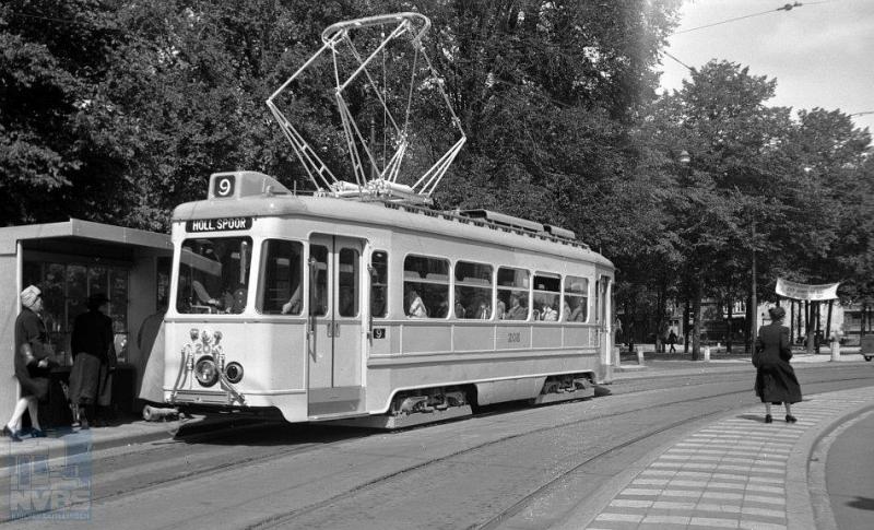 De eerste – bescheiden – bestelling van nieuw materieel ging in 1947 naar Werkspoor te Utrecht: zestien vierassige motorwagens voorzien van een aantal nieuwigheden voor een stadsmotorwagen, zoals lucht- en railremmen en een optische signaalinrichting. Zij werden op verschillende lijnen ingezet, met en zonder aangepaste bestaande vierassige bijwagen. Op de foto van J. Voerman zien we lijn 9 met de 207 bij de halte Tournooiveld. De motorwagen zier er nog erg nieuw uit; niet zo verwonderlijk want het is zijn eerste rijdag: 20 augustus 1948. (NVBS-fotonummer 249.154).