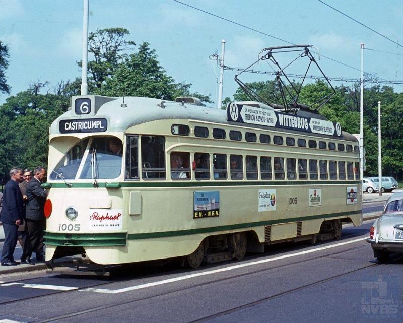 De PCC-car was het antwoord op de vraag hoe de echte vernieuwing van het wagenpark gestalte moest krijgen. De Presidents’ Conference Car was in de dertiger jaren in de Verenigde Staten ontwikkeld met het doel als trambedrijf een antwoord te hebben op het oprukkende vervoer per bus. Licenties kwamen ook naar Europa en verschillende fabrieken zijn deze rijtuigen gaan bouwen. Alle orders van de HTM voor PCC-cars in een periode van 25 jaar gingen naar La Brugeoise in Brugge. De eerste serie, nog met ‘Amerikaanse’ kleine zijramen kwam in 1949 in dienst. Dat wil zeggen twee rijtuigen; 22 stuks volgden drie jaar later. Aanvankelijk met conducteur maar later zonder, hetgeen bij drukte veel oponthoud gaf in een tijd dat nog hoofdzakelijk met contant geld werd betaald. De 1005 op de foto is al eenmanwagen, te herkennen aan de rode schijf voorop. Een tram uit de eerste serie die lijn 6 als werkterrein had. De dia is door T. Hobma op 28 augustus 1964 gemaakt op de Bezuidenhoutseweg. In de jaren erna zijn nog eens 210 PCC-rijtuigen het wagenpark komen versterken: u begrijpt dat dit tegelijkertijd voor veel oudjes het einde betekende. De pluriformiteit zou geleidelijk minder worden…