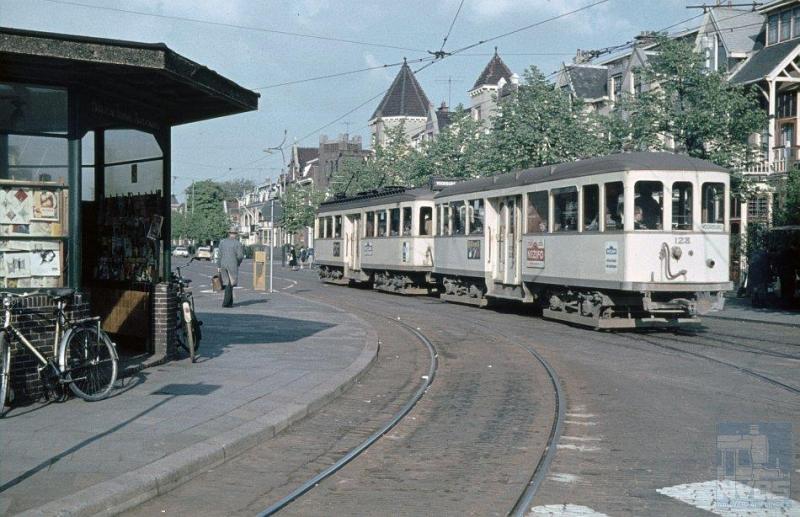 De mijnen in Limburg waren nog volop in gebruik en het elektrisch materieel van de Limburgsche Tramweg Maatschappij was niet echt oud, toch beëindigde de LTM successievelijk al haar tramlijnen in de dertiger en veertiger jaren, met Heerlen – Kerkrade in 1950 als laatste. De HTM kocht tien motor- en twintig aanhangwagens uit de boedel die – vanwege de 1200 V spanning op de lijnen in de Mijnstreek – uitstekend geschikt waren als aanvulling op het buitenlijnmaterieel. Werkspoor in Utrecht bouwde tien motor- en bijwagens om tot eenrichtingwagens, vernieuwde het interieur en veranderde de donkere LTM-kleurstelling in het HTM-crème. Zo kwamen zij in 1951 in dienst op de lijnen naar Voorburg en Wassenaar; Delft en Leiden kenden een kopeindpunt dus dat was voor eenrichtingwagens geen optie. De tien overige bijwagens konden op alle interlokale lijnen worden ingezet. De foto toont stel 90 met 128 op de Geestbrugweg te Rijswijk, op weg naar Voorburg. Een dia van J. Vogels uit 1963. Deze motorwagen is als enige bewaard gebleven en gaat binnenkort na veel omzwervingen gemaakt te hebben met de oorspronkelijke groene kleur en nummer – 610 – terug naar Zuid-Limburg.
