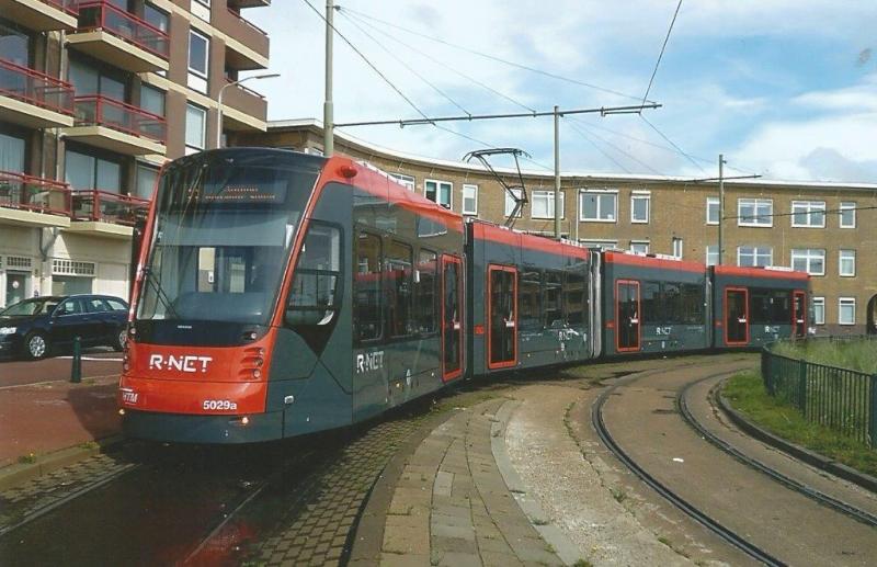 De tot nu toe laatste nieuwe aanwinst bij de HTM betreft de vierdelige Avenio van Siemens. Een serie van 60 stuks bestemd om de slechtste GTL’s, zo’n 35 jaar oud, te vervangen. Op 5 juli 2014 onthult Prins Willem Alexander op het Kerkplein de 5003 als eerste. In 2016 gingen de Avenio’s ook op lijn 11 rijden waar deze foto bij het Scheveningse eindpunt is gemaakt op 14 juni 2016. Wederom een foto van eigen makelij, want recente foto’s zijn nog niet in de Beeldbank te vinden. De 5029 is evenals alle soortgenoten geschilderd in het roodgrijs van R-Net (Randstad-Net): ook in andere Nederlandse steden kun je trams en autobussen in deze uitvoering tegenkomen.