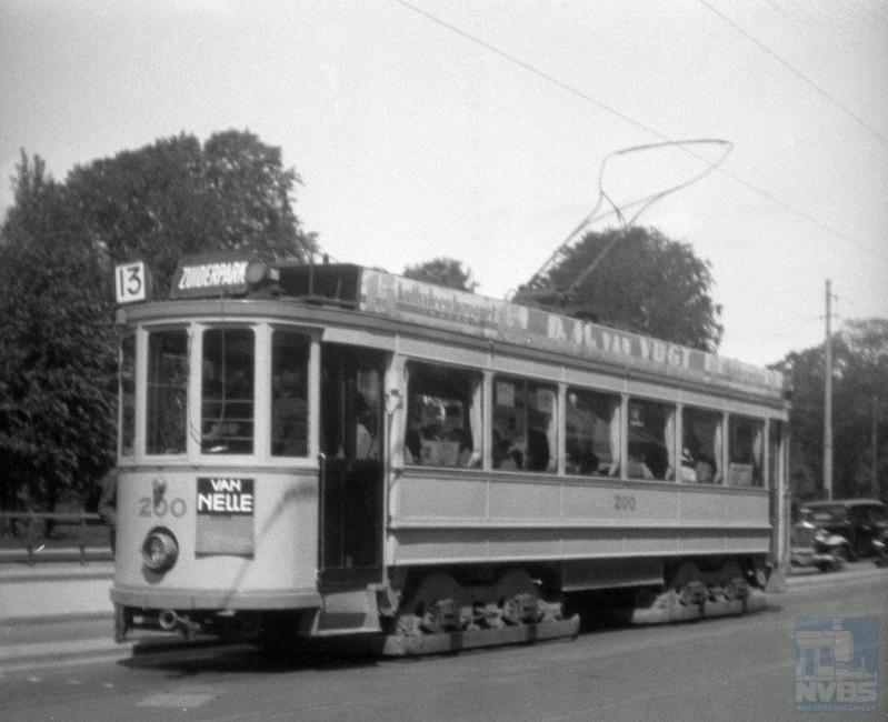 De 200, de eerste vierassige stadsmotorwagen van Nederland, was het prototype van een serie bestemd voor interlokale lijnen rond Den Haag. Daarvan werd uiteindelijk niets gerealiseerd en dus kreeg de 200 geen volgelingen. Werkspoor bouwde het in 1908. Het fraaie rijtuig heeft op verschillende lijnen dienst gedaan, maar de laatste jaren voornamelijk op lijn 13. Na terugkomst bij de HTM uit Duitsland in 1947 heeft het rijtuig met nummer 300 nog tien jaar dienst gedaan als aanhangwagen. De foto is in 1935 door een onbekende fotograaf op de Bezuidenhoutseweg gemaakt. (NVBS-fotonummer 109.020)