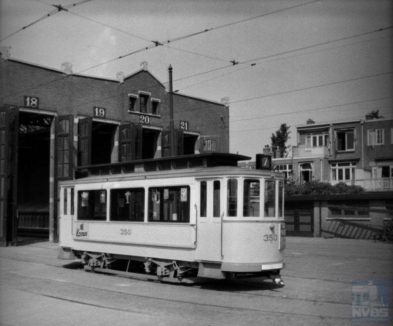 De foto met NVBS-fotonummer 109.082, wederom van J.A. Bonthuis, is waarschijnlijk gemaakt vlak nadat de 350 van deuren was voorzien in de werkplaats Lijsterbesstraat, in de zomer van 1944. Bij aflevering bevond er slechts een hekje en een ketting daar waar nu de deuren zijn. Aan de witte streep op de bufferbalk, ook aanwezig op enkele voorgaande foto’s, is te zien dat het een plaatje uit oorlogstijd is. Ook de hier getoonde aanhangwagen 350 is een eenling gebleven. Werkspoor heeft dit rijtuig in 1908 gebouwd omdat de HTM behoefte had aan meer gesloten aanhangwagens, die goed zouden passen bij de ‘drieramers’. Een onderstel ontbrak; de wielassen waren aan de wagenbak vastgemaakt. Hoewel de 350 goed beviel, kwamen ook hier geen nakomelingen.
