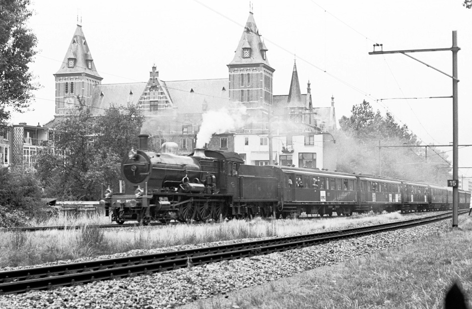 Utrecht, 20 augustus 1975. Loc 3737 passeert de plek waar vroeger de halte Biltstraat was. De trein is bestemd voor bezoekers van het MOROP-congres dat door de NVBS werd georganiseerd. In de achtergrond het Ooglijdersgasthuis. De halte Biltstraat bestond uit een eilandperron. Hier stapten meer passagiers in en uit dan bij het ongunstig gelegen Maliebaanstation. Tegenwoordig is alleen het achterste spoor nog in gebruik, voor treinen naar of van het Spoorwegmuseum.