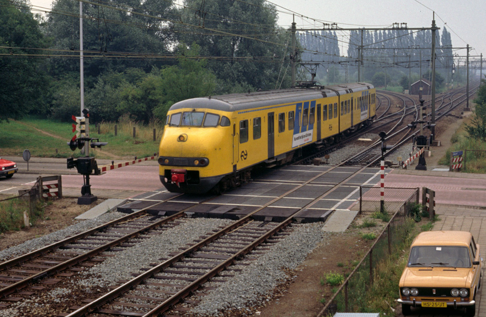 Een trein uit Hilversum passeert de overweg in de Eykmanlaan. Rechts in de achtergrond de spoorkruising Blauwkapel. De foto is op 23 juli 1989 gemaakt vanaf Post T. De gele Lada is van de fotograaf.