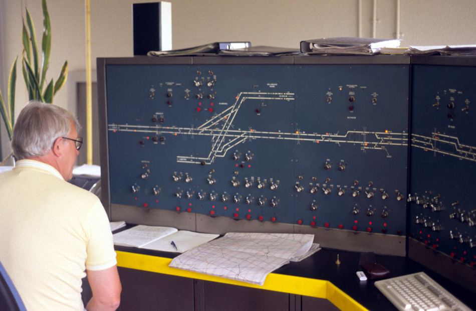 Het bedieningspaneel van Post T bij Blauwkapel op 23 juli 1989. Het kruis en de verbindingsbogen zijn duidelijk te zien. Rechts op het paneel de stations Bilthoven en Den Dolder, die ook vanuit Blauwkapel werden bediend.