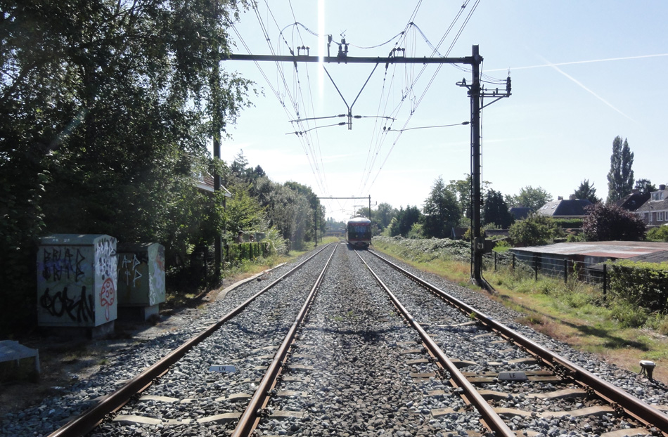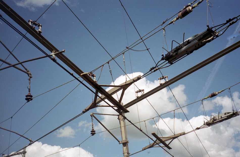 Op 27 augustus 2001 kwam mijn trein naar Bilthoven stil te staan op de kruising bij Blauwkapel, ik denk om een intercity voorrang te verlenen. Heel gemakkelijk voelde ik mij niet, zo midden op de kruising, maar ik had nu wel de kans om wat foto’s te maken van de bijzondere bovenleidingconstructie. De bovenleiding van de sporen naar Hilversum hangt hier een eindje boven die van de sporen naar Amersfoort.