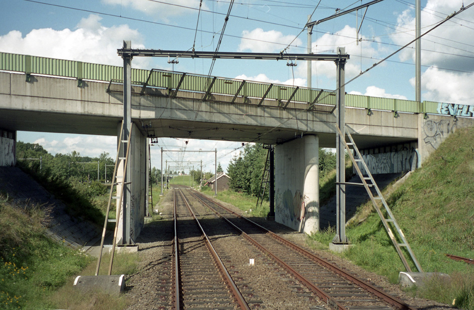 Vanuit een trein die stilstaat op de kruising kijken we in de richting van de Voordorpsedijk. De fly-over wordt gebruikt door intercity’s en goederentreinen. 27 augustus 2001.
