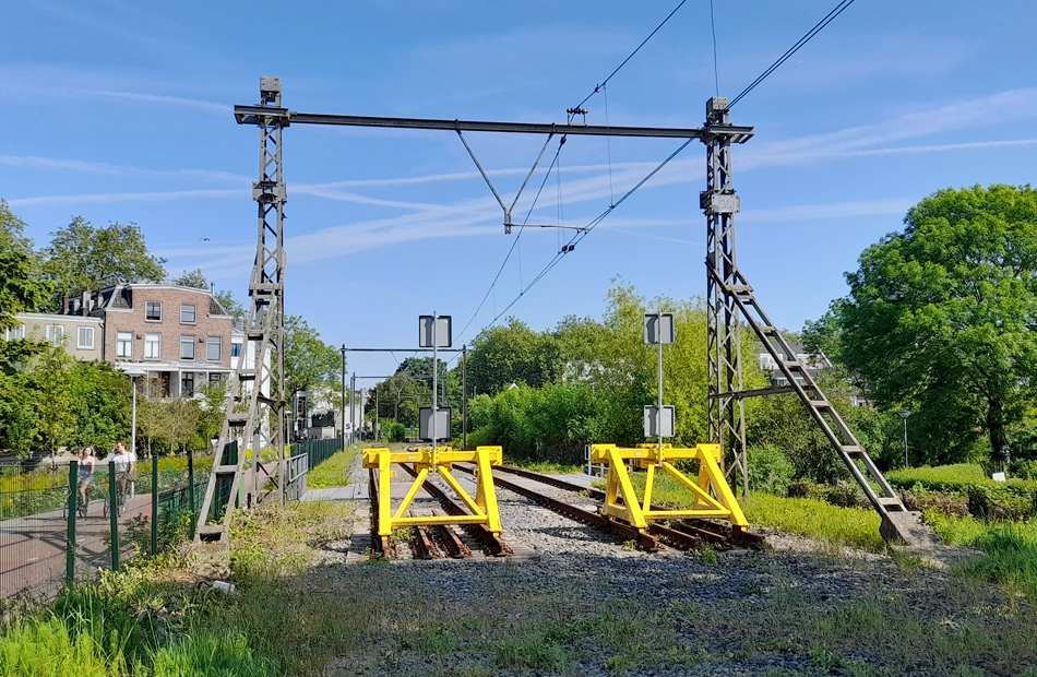 Utrecht, 15 mei 2022. Hier eindigt tegenwoordig de Oosterspoorweg, iets voorbij het Spoorwegmuseum. De sporen naar Lunetten zijn opgebroken, maar de meeste bovenleidingportalen zijn blijven staan. Daar kun je nu onderdoor wandelen of fietsen.