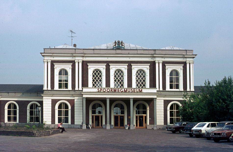 Voorplein van het Spoorwegmuseum op 9 juni 1973. Dit museum is sinds 1954 ondergebracht in het vroegere Maliebaanstation, eindpunt van de Oosterspoorweg uit Hilversum. Dat station lag ongunstig ten opzichte van de stad. Toen bij Blauwkapel een verbindingsboog was aangelegd, konden de treinen uit Hilversum doorrijden naar Utrecht CS en raakte het station aan de Maliebaan zijn bestaansrecht kwijt.
