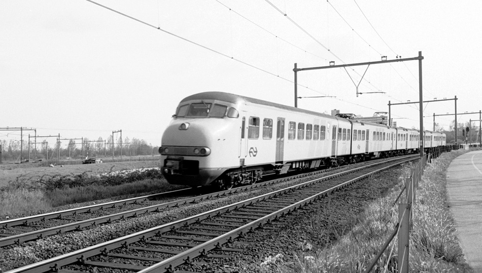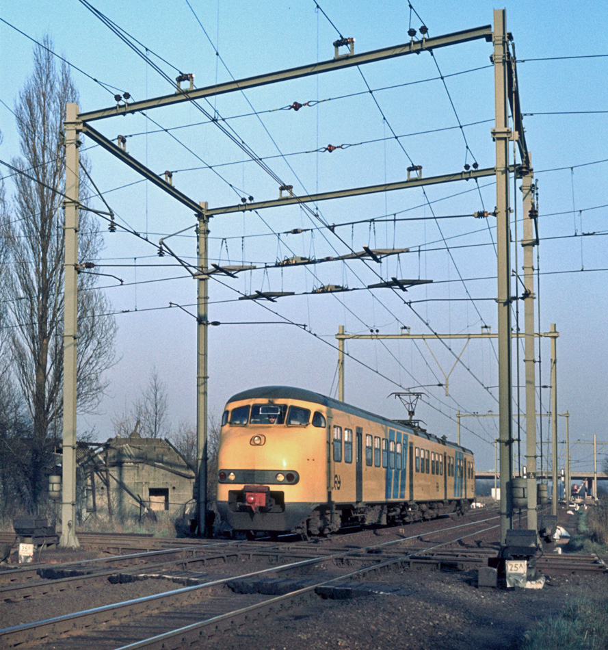 Utrecht, 6 mei 1975. Treinstel 531 is op weg van Utrecht naar Hilversum. De trein rijdt over de in 1921 aangelegde verbindingsboog. Links in beeld de spoorkruising waar dit artikel over gaat, rechts buiten beeld ligt fort Blauwkapel.