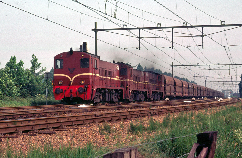 Utrecht, 29 mei 1976. Locs 2288, 2274 en 2247 op de laatste dag waarop deze ertstreinen met diesel werden gereden. De trein komt uit Hilversum en zal via Lunetten naar Duitsland rijden. De laatste wagens rijden nog over de kruising. Er liggen hier vier sporen: de twee rechtersporen vormen de verbindingsboog naar Amersfoort. Achter de rug van de fotograaf is later de wijk Voordorp gebouwd.