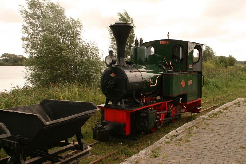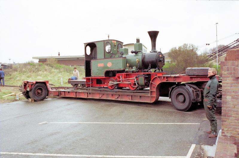Loc 4 wordt met behulp van een dieselloc op een dieplader gereden. Hetzelfde gebeurt met een zelfgebouwd rijtuig, dat tegenwoordig voorzien is van latjes, waardoor het er ouder uitziet.