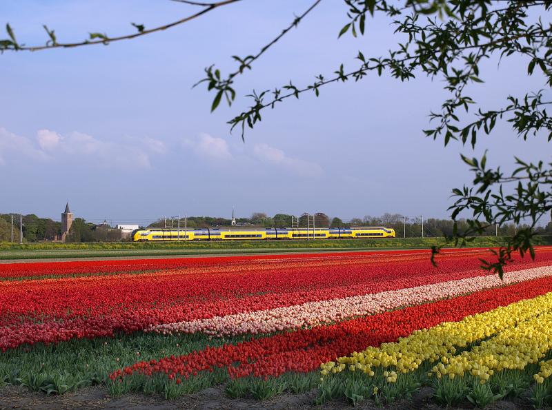 Het fotografische hoogtepunt van het bollenseizoen 2016 was voor mij toch wel deze foto van een Reeks 28 met een set Belgische rijtuigen, die net een week eerder in dienst waren gekomen, in de Beneluxdienst. Lang zouden de rijtuigen het niet uithouden, want nog geen maand later keerden de rijtuigen door problemen met de deuren weer terug naar België. De rode tulpen heten Ad Rem. Dit veld was een van de laatste waar dit voorjaar nog rode tulpen waren te zien. Ik heb hier begin mei heel wat uurtjes doorgebracht…