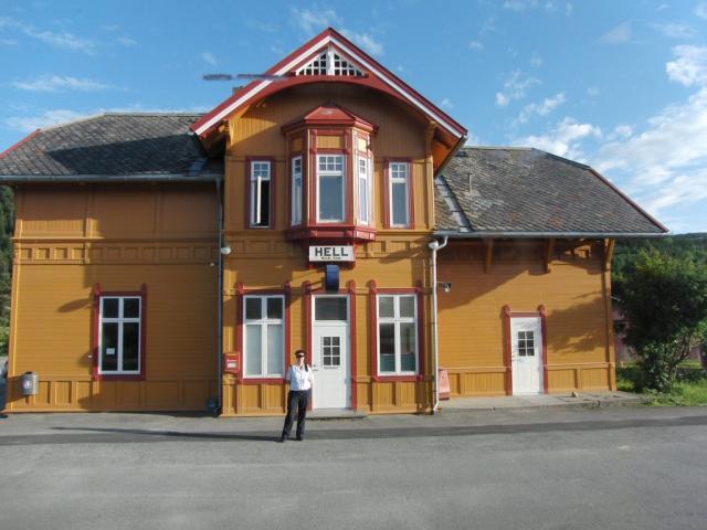 De enige dagtrein Bodø-Trondheim is gelukkig geen Talent, maar een echte langeafstandstrein met Di4-loc en vijf rijtuigen, sommigen zelfs uit de jaren vijftig. We zitten er bijna 10,5 uur in en leggen in die tijd 729 km af. ’s Nachts rijdt dezelfde trein, aangevuld met twee ligwagens, terug naar het noorden. Om 14:30 steken we de poolcirkel over op weg naar het zuiden. Kort daarna staan we een tijdje in Dunderland te wachten op de tegentrein. Uiteindelijk komen we met +20 om 22:30 aan in Trondheim. Foto: Theo Gramser, juli 2010