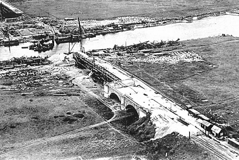 Helaas was de bruggen geen lang leven beschoren. Onder dreiging van de Duitse invasie werden ze op 10 mei 1940 door de Genietroepen van het Nederlandse leger opgeblazen. Herstel koste weinig tijd, zodat op 17 november in datzelfde jaar de eerste trein alweer de IJssel over kon. Foto: zomer 1945.