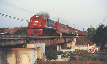 De Indonesische spoorwegen maken vrijwel uitsluitend gebruik van dieseltractie. Een personentrein arriveert in de laatste minuten daglicht te Yogyakarta.9 oktober 1994. Foto: Maurits van den Toorn.