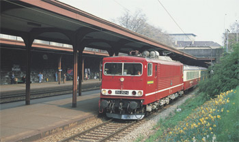 Een goederen-locomotief uit de voormalige DDR met een reizigerstrein in Zwitserland was ooit volstrekt ondenkbaar. De 250 252, in dienst van de SOB met een spitsuur-trein naar Zürich Hbf.Zürich Wiedikon; 29 april1991. Foto: Raymond Kiès.