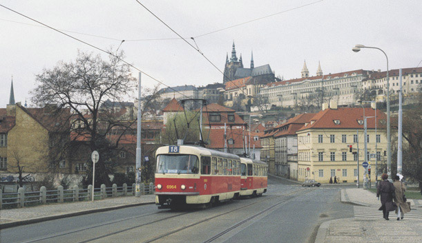 Een klassiek beeld: de Praagse burcht met op de voorgrond een stel Tatra T3-trams, die al decennialang deel uitmaken van het straatbeeld.Mánesův Most, 1 maart 1998. Foto: Maurits van den Toorn.
