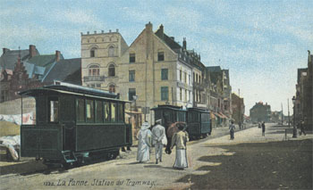De Panne. Vierassige paardentrams aan het eindpunt Zeelaan. We kijken in de richting Noordzee.Prentbriefkaart.