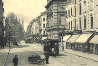 De paardentram van Leuven medio 1909. Een open rijtuig op de nieuwe trambaan in de Stationsstraat (nu: Bondgenotenlaan) op weg naar het station. Op de achtergrond het stadhuis, waarvan de zijgevels tussen 1895 en 1913 werden gerestaureerd. Prentbriefkaart.