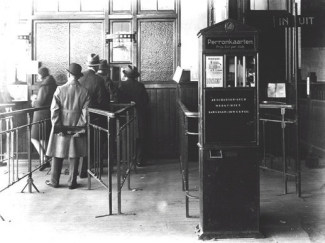 Dit beeld doet vermoeden dat treinreizigers zich ′met gedekten hoofde′ aan het loket moeten melden. Op de voorgrond staat een automaat die na inworp van twee munten van 2½ cent een perronkaartje produceert. Foto: Het Utrechts Archief.