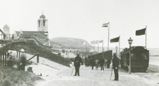 In de zomermaanden reed de Rijnlandsche tram naar de boulevard van Katwijk. Erg succesvol bleek dit traject niet; er werd veel hinder ondervonden van opgewaaid zand, dat ontsporingen veroorzaakte. Foto: verzameling Stichting Historisch Genootschap ′De Blauwe Tram′.