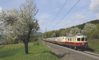 Re 4/4 I 10034 behoort tot de collectie van TEE-Classics en is teruggebracht in de staat zoals de machine jarenlang voor TEE-treinen was te zien. Op 18 april 2009 assisteerde de locomotief tussen Basel en St. Margarethen loc DB 103 184 met een extra-trein, hier bij Umiken. Foto: Reinhard Reiss.