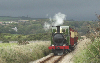 Stoomloc C.H. Wood dendert op snelheid tussen Castletown en Port St. Mary naar Port Erin op 17 september 2008. Foto: René Platjouw.
