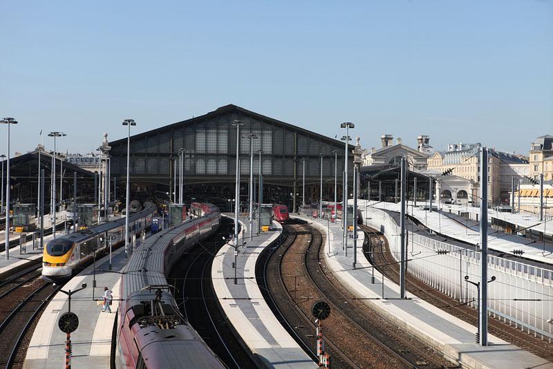 Het hedendaagse Gare du Nord met een aantal Thalys- en Eurostartreinstellen op 30 juni 2011. Het Eurostar-stel links draagt het SNCFlogo en wordt ingezet in de binnenlandse dienst.Foto: Maurits van den Toorn.