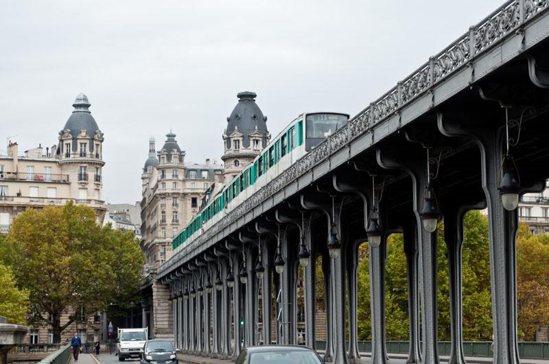Parijs is een stad waar veel films spelen. Wie zich de film ‘Last Tango in Paris’ herinnert: een scène speelt zich af tussen deze pilaren, die het viaduct van metrolijn 6 ondersteunen, op de Seinebrug Pont de Bir Hakeim. Luchtbanden-stel 6518 (type MP73) steekt op 19 oktober 2012 de rivier over.Foto: Ambrosius Baanders.