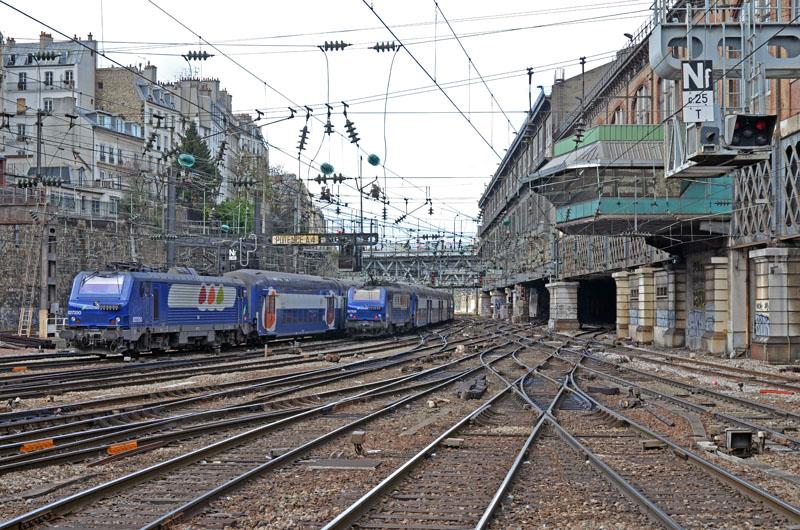 ‘Prima’ BB (8)27350 arriveert met een dubbeldekstrein in Gare St.Lazare en ‘Prima’ BB (8)27338 vertrekt er met één; 21 april 2012. Locomotieven van dit type werken nu het grootste deel van het vervoer vanuit St.Lazare af; hun plaats zal de komende jaren worden ingenomen door treinstellen, waarna ze zullen doorschuiven naar de goederendienst.Foto: Raymond Kiès.
