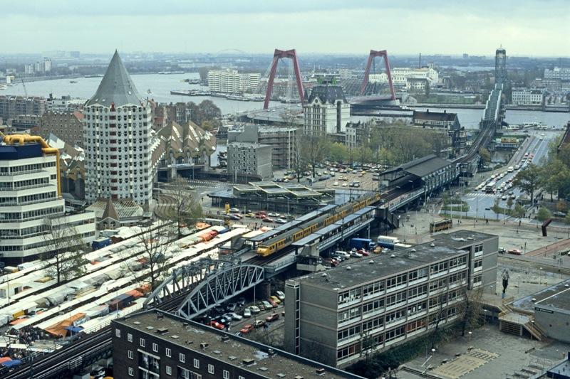 Plan T bereed ruim een kwart eeuw het Luchtspoor in Rotter dam, de Willemsbrug en de Hef. Op de foto een stel op het station Blaak op 1 november 1986; het geluid van treinen op deze volledig stalen route mag u er zelf bijdenken. Foto: Wim van der Ent.
