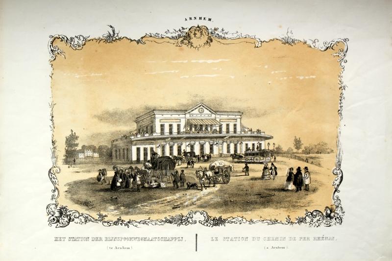 Het stationsgebouw in Arnhem, gebouwd in 1845 en in 1867 vervangen door een groter gebouw. Over dit station had de RvT de klacht dat het voorplein bij regenachtig weer één grote modderpoel werd. In 1862 bracht de NRS daarom een laag fijn grint aan, maar niet genoeg naar de zin van de RvT. Afbeelding: verzameling auteur.
