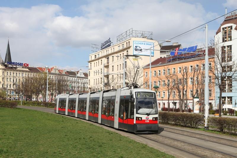 Een lange Ulf van het type B op lijn 6 nabij het Westbahnhof op 1 april 2012. Goed te zien is dat elke wagenbak een eigen deur heeft. Foto: Maurits van den Toorn.