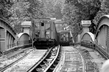 Het vooroorlogse ‘matériel Sprague- Thomson’ domineerde lang de metro van Parijs. Twee stellen kruisen elkaar op lijn 2, bij Barbès Rochechouart, op 9 juni 1978.Foto: Ambrosius Baanders.