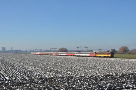 NMBS-locomotief 1182 is met trein 9217 Brussel – Amsterdam net Zevenbergen gepasseerd; 8 december 2012. Aan het einde van de trein loopt de NMBS 2835 in opzending mee en niet, zoals sommigen beweren, als ‘angst loc’ voor het geval de 1182 het niet zal halen. Foto: Raymond Kiès.