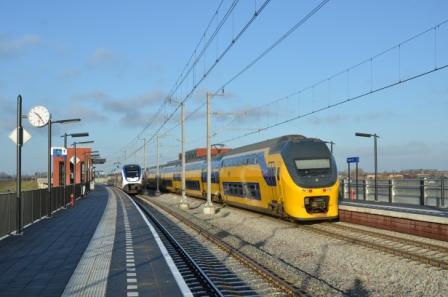 Station Kampen Zuid op 15 december 2012 met stoppende Sprinter Amsterdam C – Zwolle en voorbijrijdende intercity Leeuwarden – Den Haag C. Foto: Raymond Kiès.