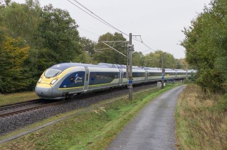 Als alles gaat zoals bedacht, zullen de e320-treinstellen van Eurostar vanaf december 2016 in de normale dienst over de HSL-Zuid rijden. Nu nog zijn deze treinstellen het lijdend voorwerp van een uitgebreid testprogramma, zoals hier op de Siemens-testring in Wegberg-Wildenrath; 25 oktober 2013. Foto: Bruno Batenburg.