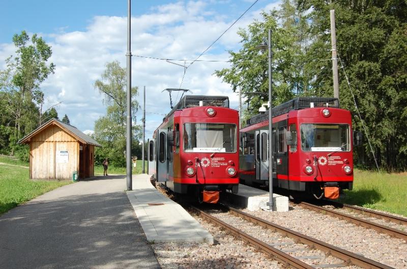 De van de Trogener Bahn overgenomen tramstellen 21 en 24 kruisen elkaar bij de halte Lichtenstern. De 24 rijdt richting Klobenstein, de 21 richting Oberbozen;5 juli 2013. Foto: Hans Vollebregt.