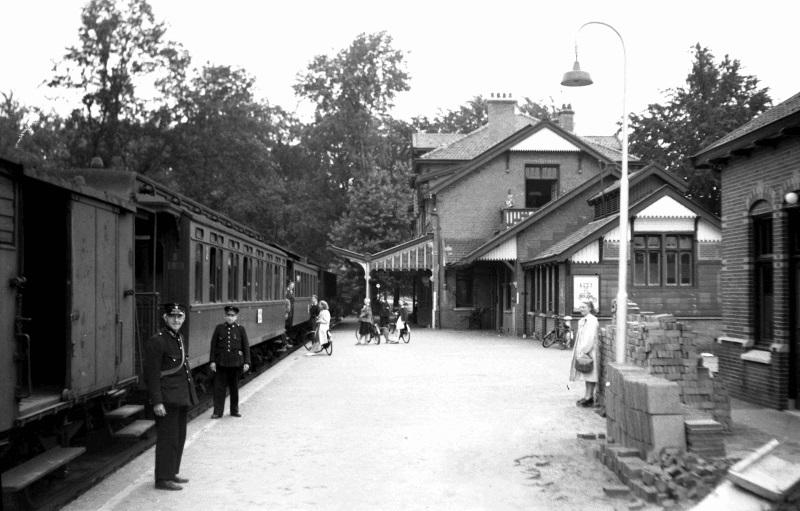 Station Baarn Buurtstation (nu Eethuys De Generaal) met voor vertrek gereed staande trein op laatste dag van de stoomexploitatie; 24 juli 1948. Foto: J.A. Bonthuis;archief NVBS Railverzamelingen.