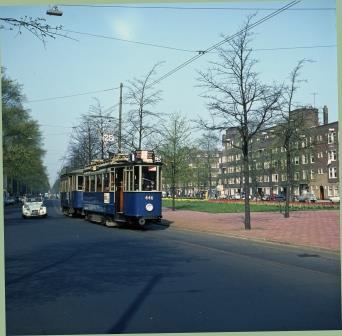 Aan de ’goede’ kant van de Churchilllaan is in de lente van 1964 motorwagen 446 onderweg naar het eerder dat jaar omgedoopte eindpunt President Kennedylaan. Foto: Frits van der Gragt.