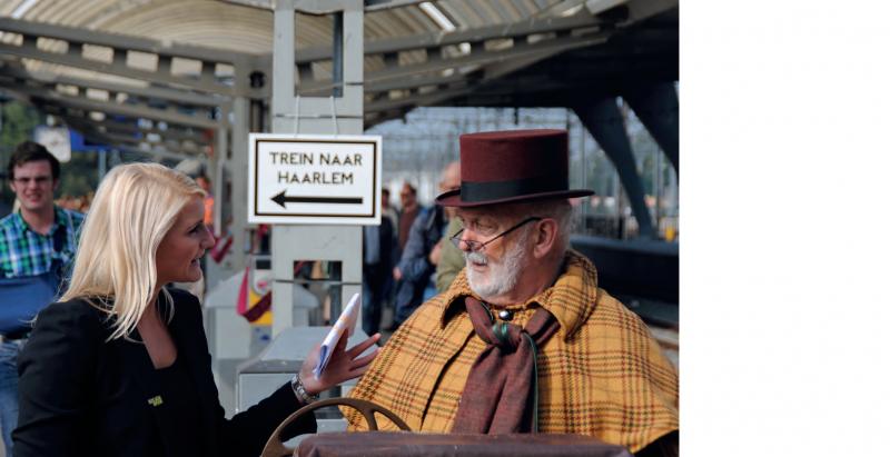 Feest in Amsterdam; 20 september 2014. ‘Maar meneer, kunt u mij vertellen waar de trein naar Haarlem vertrekt?’ Foto: Arthur Staal