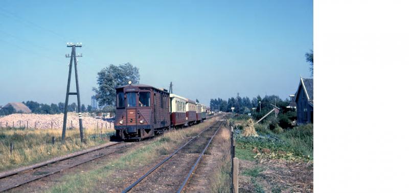 Dieselmotorwagen M67 van de RTM is met vier rijtuigen zojuist uit Spijkenisse vertrokken voor een rit naar Oostvoorne; 26 augustus 1964. Foto: J. Blok