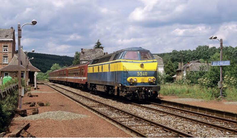 De blauwe reeks 55 is jarenlang onafscheidelijk verbonden geweest met de landschappelijk fraaie spoorlijn Luik – Luxemburg. De 5540 passeert op 3 juli 1996 met M4-rijtuigen de toen al twaalf jaar gesloten halte van Grand-Halleux. Foto: Sicco Dierdorp.