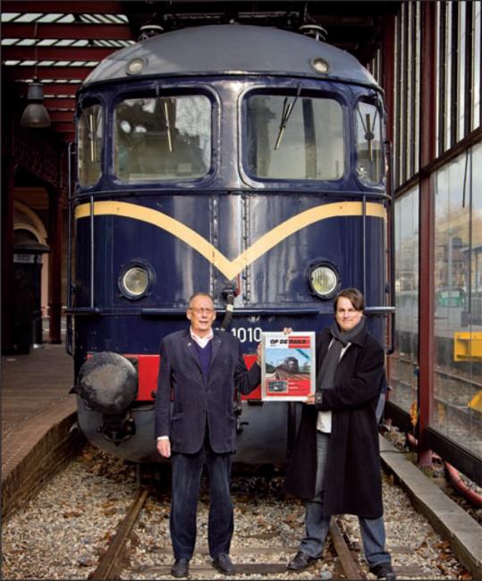 De overhandiging van de jubileum-Op de Rails aan Frits van der Gragt (links) door Maikel Rörik in het Spoorwegmuseum in Utrecht; 22 februari 2014. Foto: Koen Brouwer.